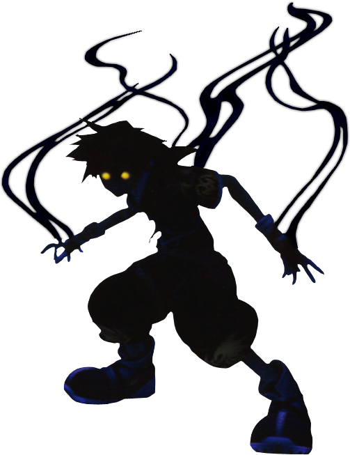 Doubling in size during a fog, Vanitas's form will become even more inhuman during these times. His face will lack definition, being almost completely feature-less sans for his glowing eyes that are more narrowed than the round they usually are, though his distinctive 'hair' shape will be an obvious clue as to who he is. His mouth is still there but invisible most of the time unless he opens his mouth revealing his razor-sharp fangs, his mouth itself larger and splitting back either further on his head than it should. His arms are a bit longer than they should be in relation to his body, almost brushing the ground as he levitates almost all the time. His hands themselves will lose shape as well in this form, now narrowing into a point where his hands should be. (He can manipulate the length and size of his pointed 'hands' while in this form as well.) The tendrils coming off his back are a constant feature during the fog and there seem to be hundreds of them visible at all times in various sizes. Part of his abdomen is missing during the fog, forming a symbol reminiscent of the Unversed symbol, making it possible to see through his abdomen.